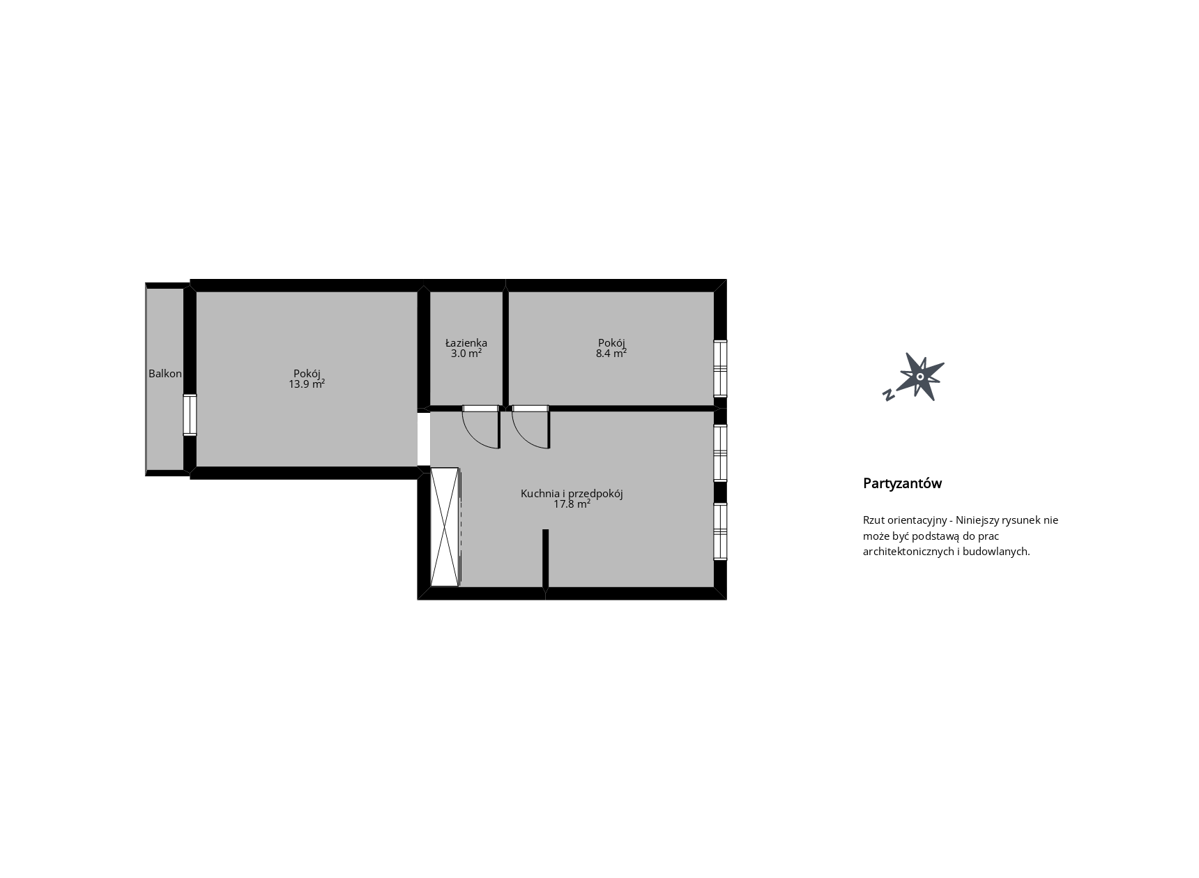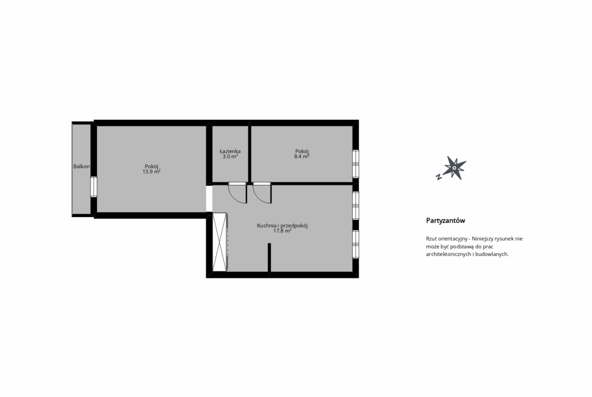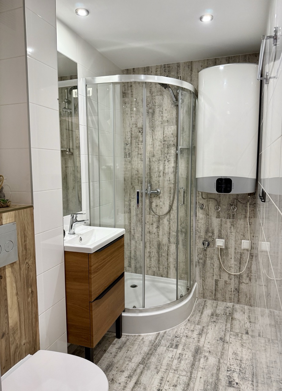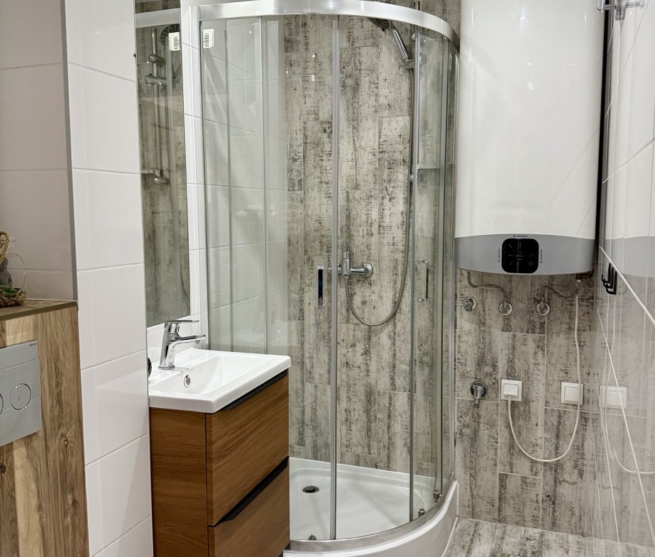Układ mieszkania jest funkcjonalny: przedpokój, kuchnia, 2 pokoje, łazienka z prysznicem.