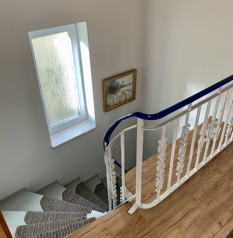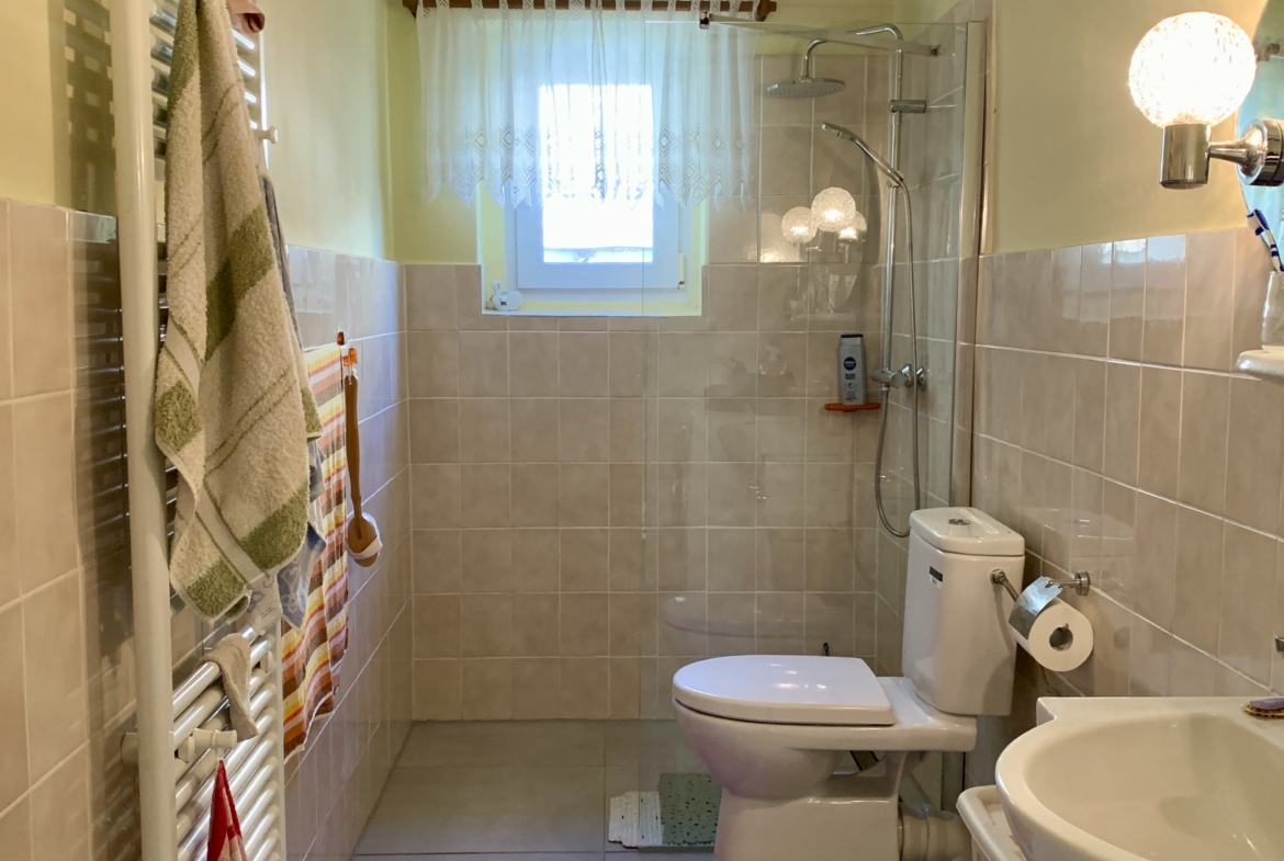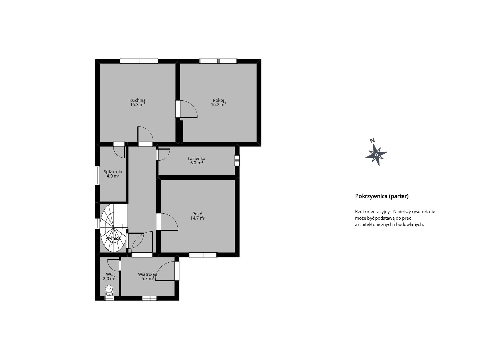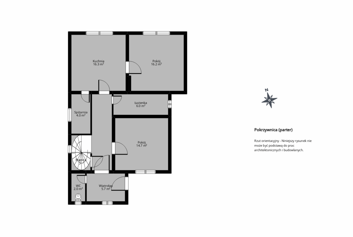 Na parterze: wiatrołap, hol, toaleta, łazienka z prysznicem, kuchnia, spiżarnia, 2 pokoje.