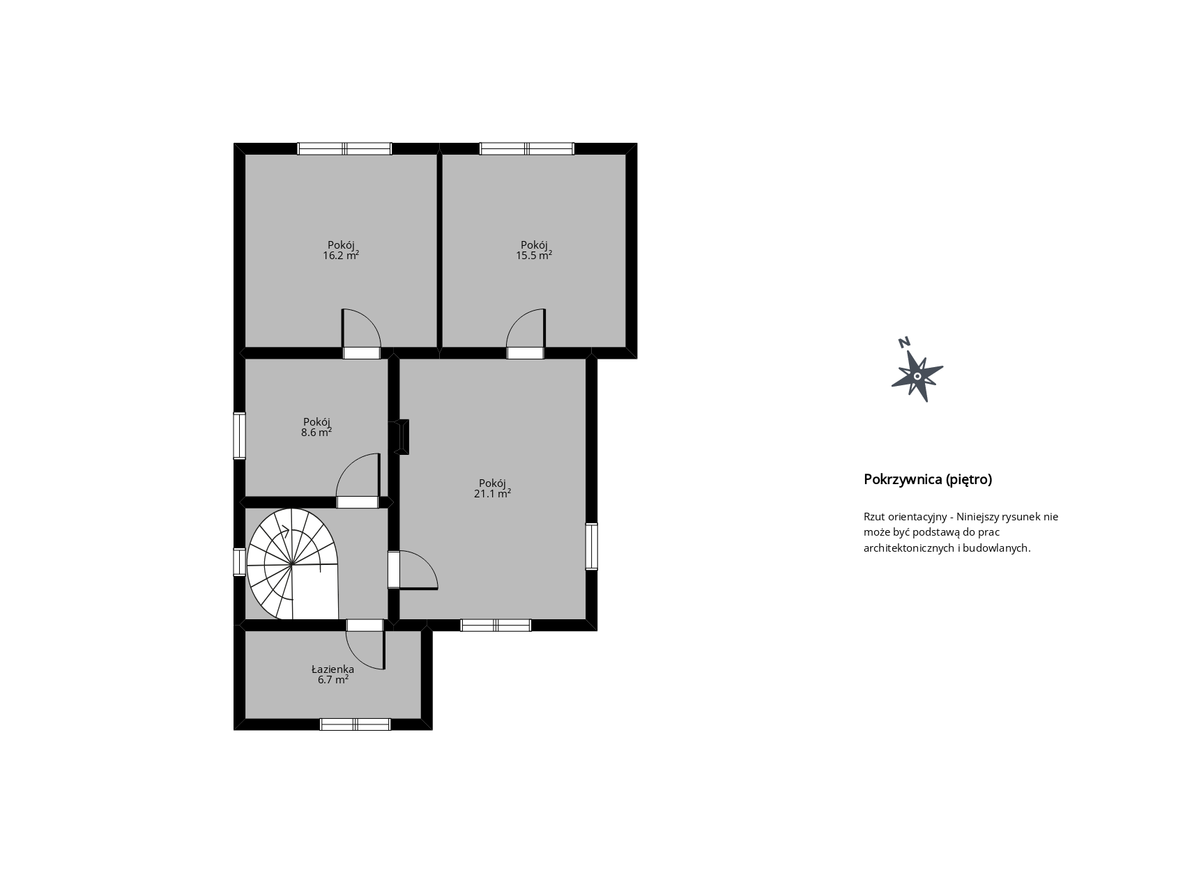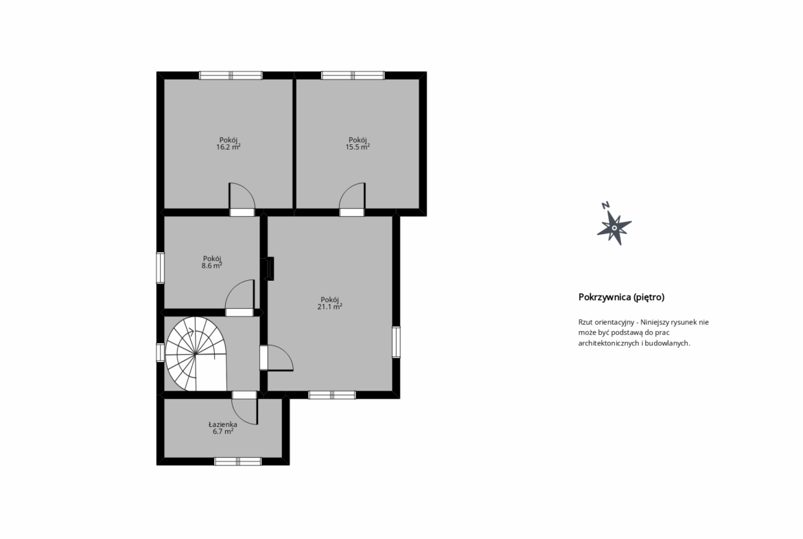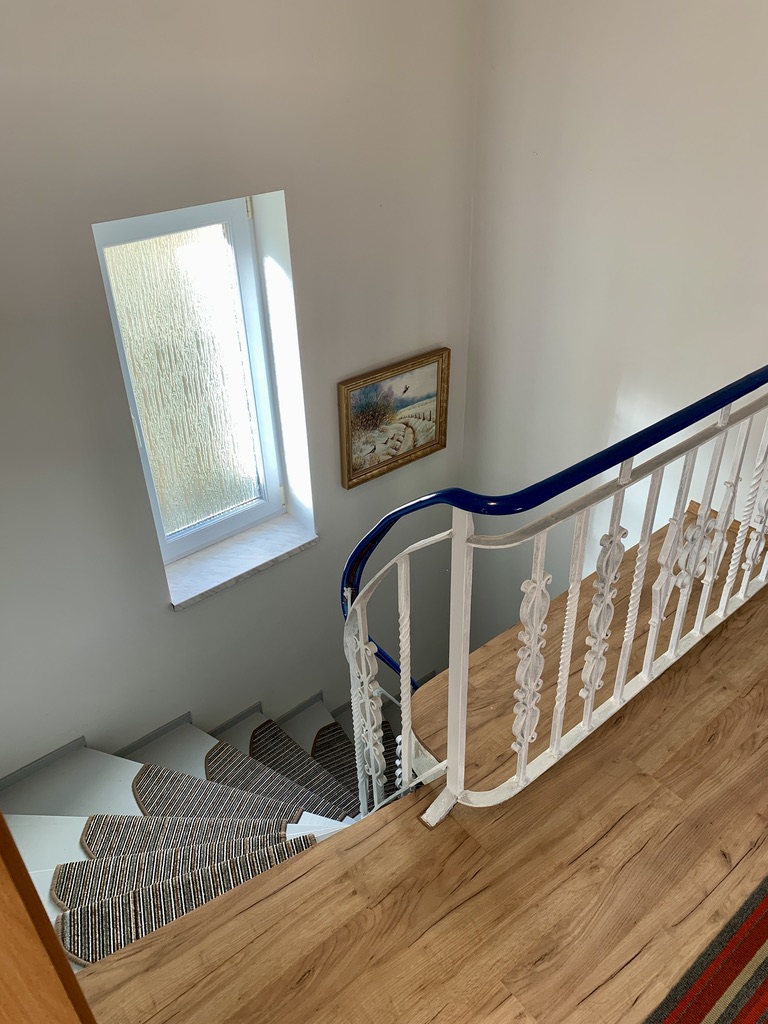 Na piętrze: hol, 3 pokoje, łazienka z prysznicem.